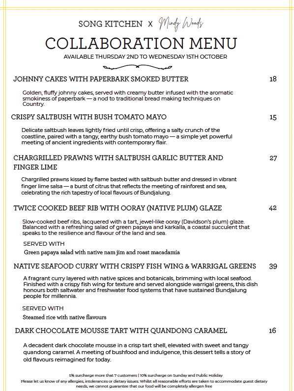 From 2–15 October 2025, celebrated Bundjalung woman, chef and author Mindy Woods is teaming up with Sydney’s Song Kitchen to launch the inaugural Supper Series: Purposeful Plates — a two-week menu where 100% of profits go directly to YWCA Australia community projects and First Nations initiatives.